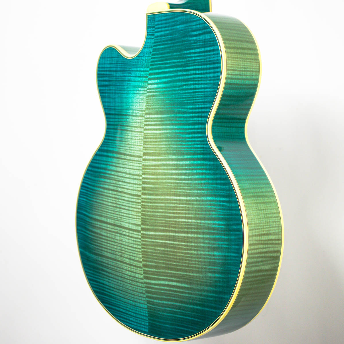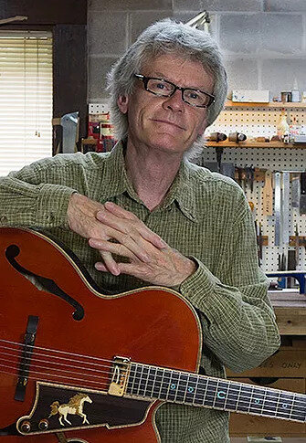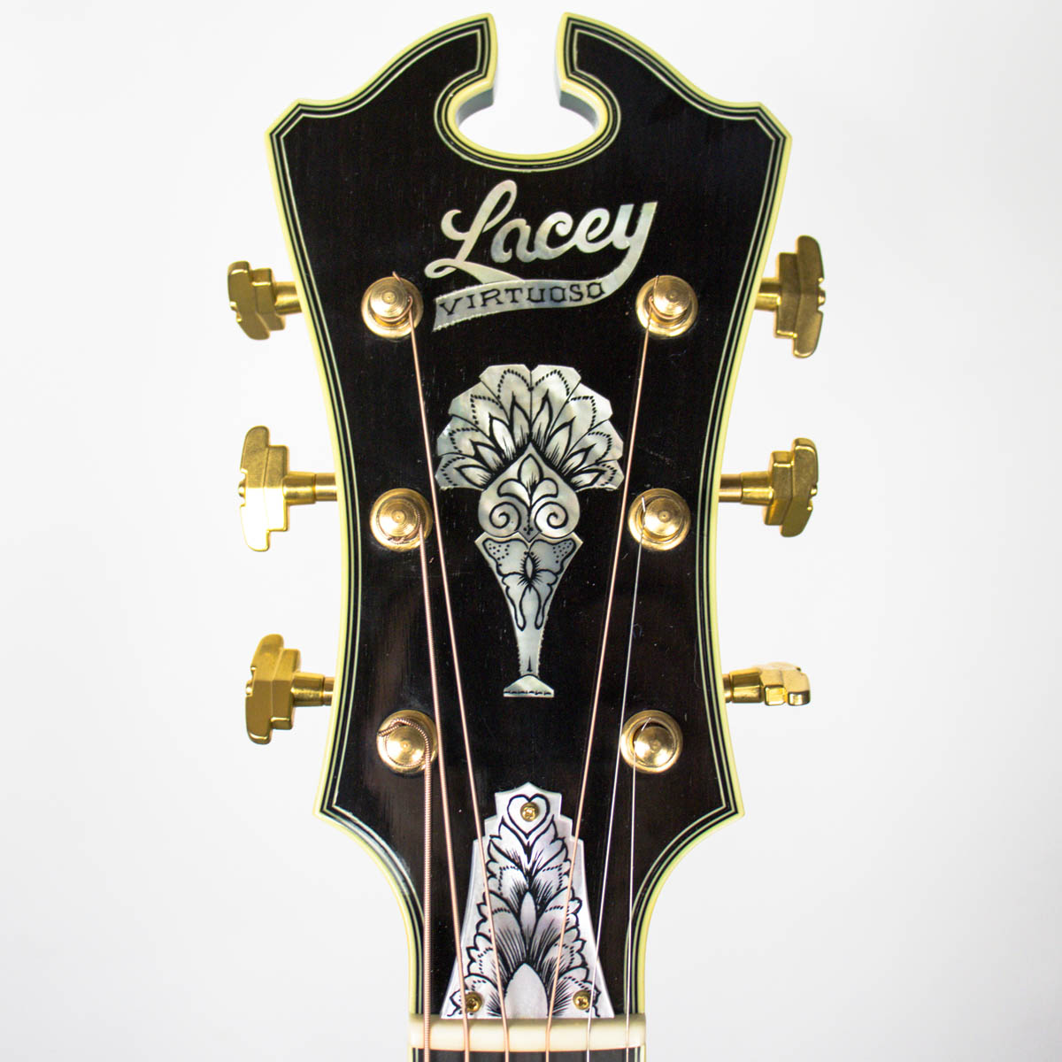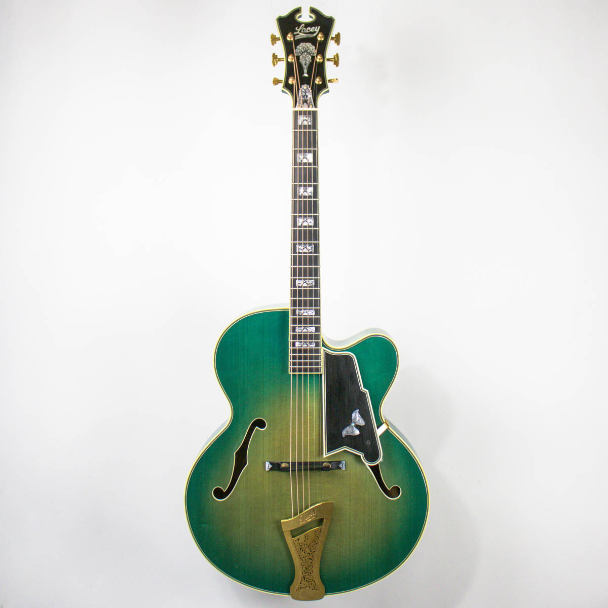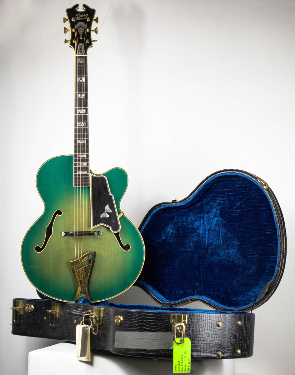 After college, Lacey moved to Oslo, Norway and spent four years working as a repairman for Norway’s largest importer of musical instruments; Norsk Musikk Instrument Company A/S. In 1979 vintage expert and dealer George Gruhn offered Lacey a position as a repairman and in 1981 he moved to Nashville. Lacey relocated to Los Angeles in 1983 where he ran a custom guitar design shop for pick-up designer Bill Lawrence, and then began repairing and building at another Hollywood guitar store.This continued until 1986 when George Gruhn contacted Lacey again asking if he would work at the Guild guitar factory located in Westerly, Rhode Island. A year later Lacey returned to Los Angeles to open his own custom guitar shop, which was called “The Guitar Garage”. In 1989 Lacey started making archtop and carved top semi-solid body electrics.