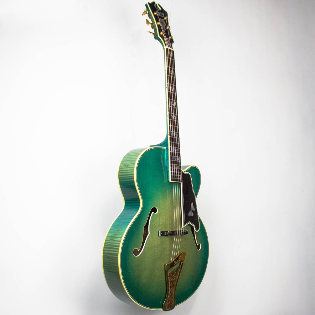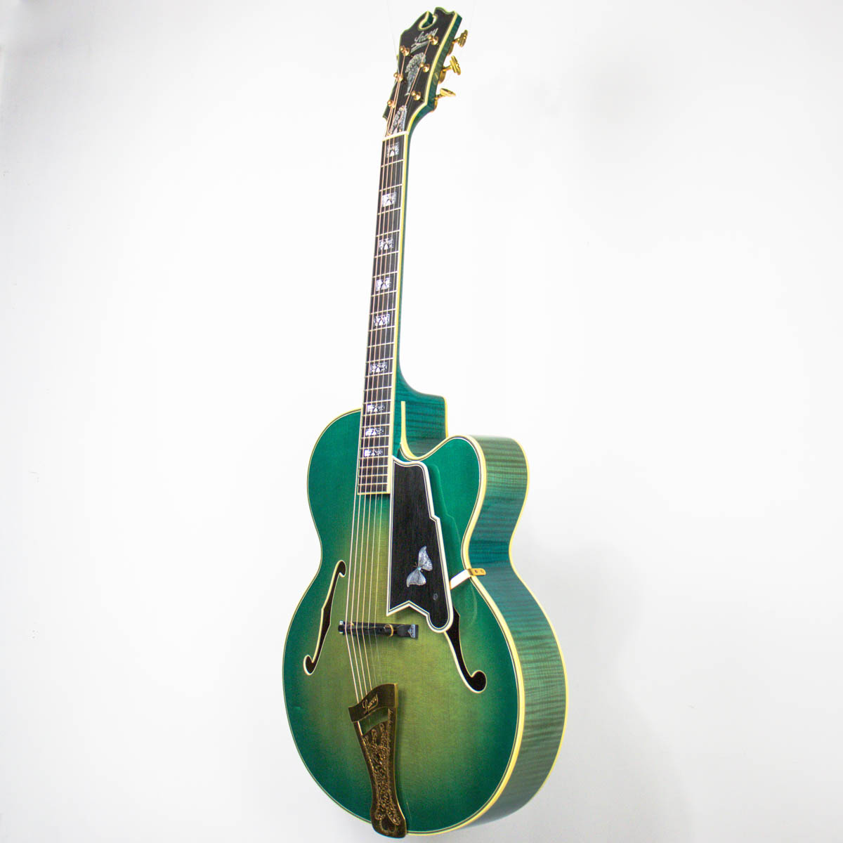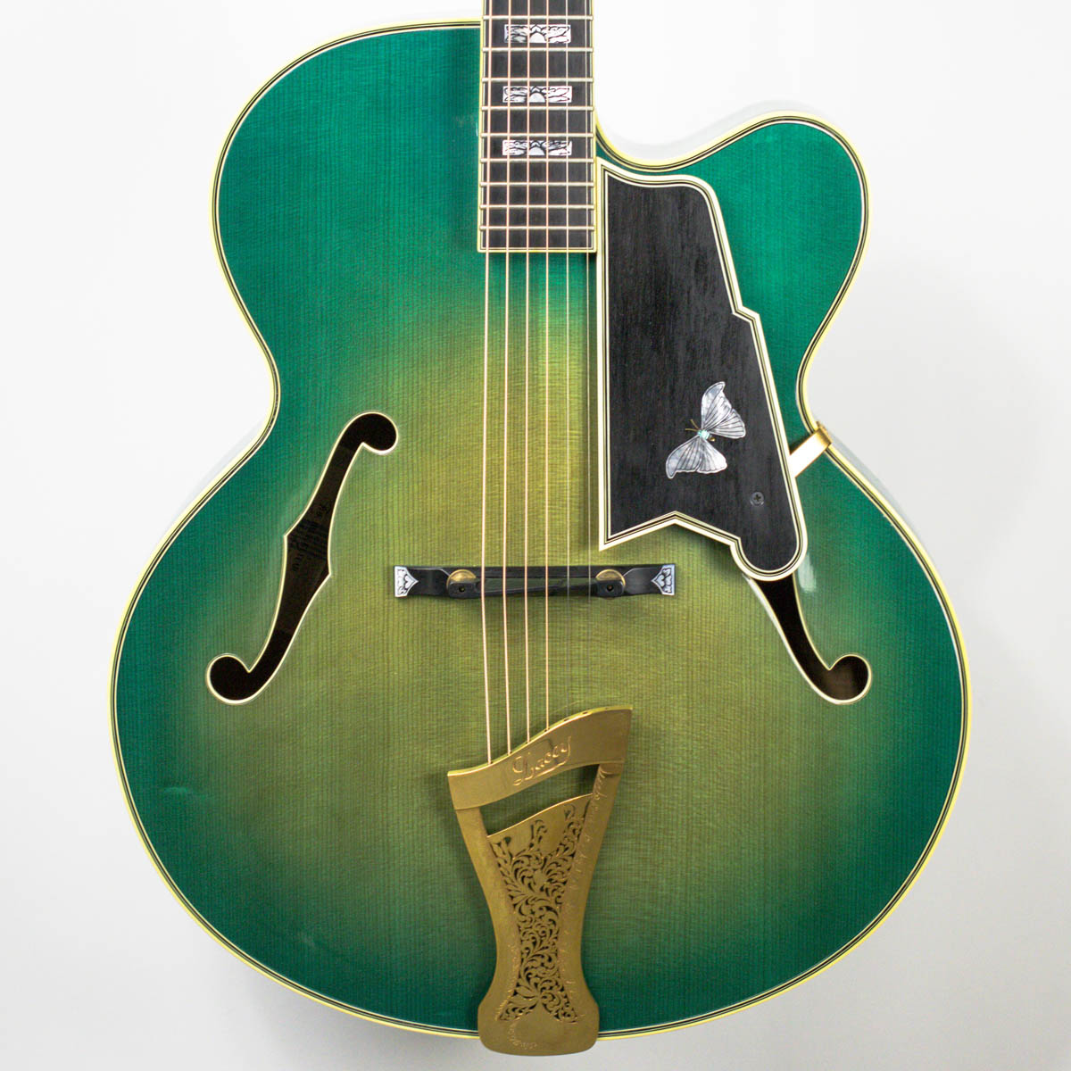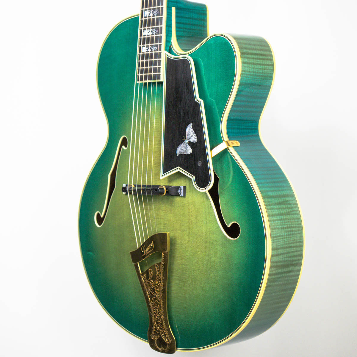 And what a guitar–it is constructed with a spruce top, flamed maple back, sides, and neck. Ebony is utilized on the bridge, fingerboard, headstock veneer, and pickguard. Abalone and pearl are used throughout the guitar on the inlays of the bridge, fingerboard, pickguard, truss rod cover, and headstock overlay. The brass tailpiece features a soap-pierced design and is engraved and plated in eighteen karat gold. The headstock also comes equipped with gold plated Grover stair step style tuning buttons.