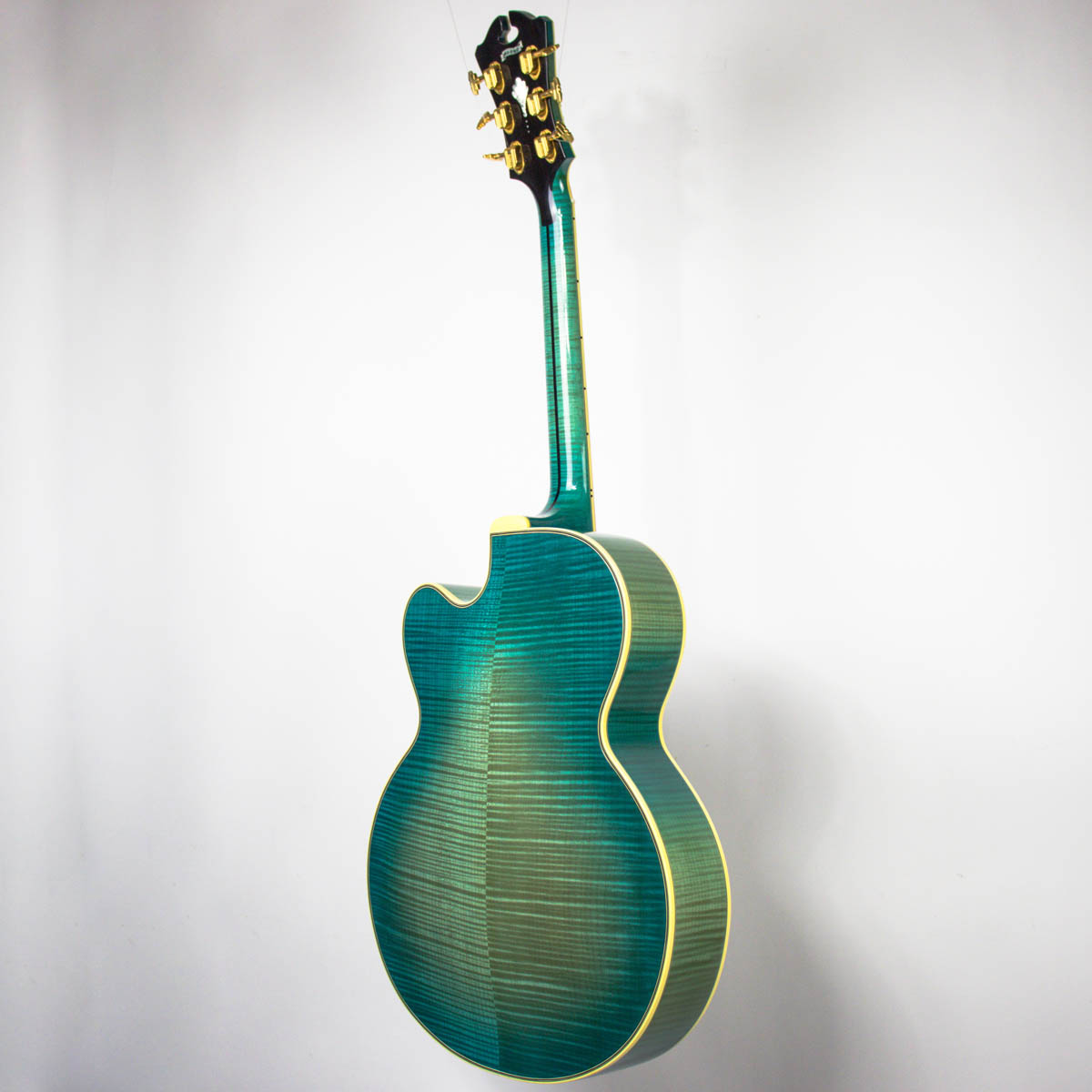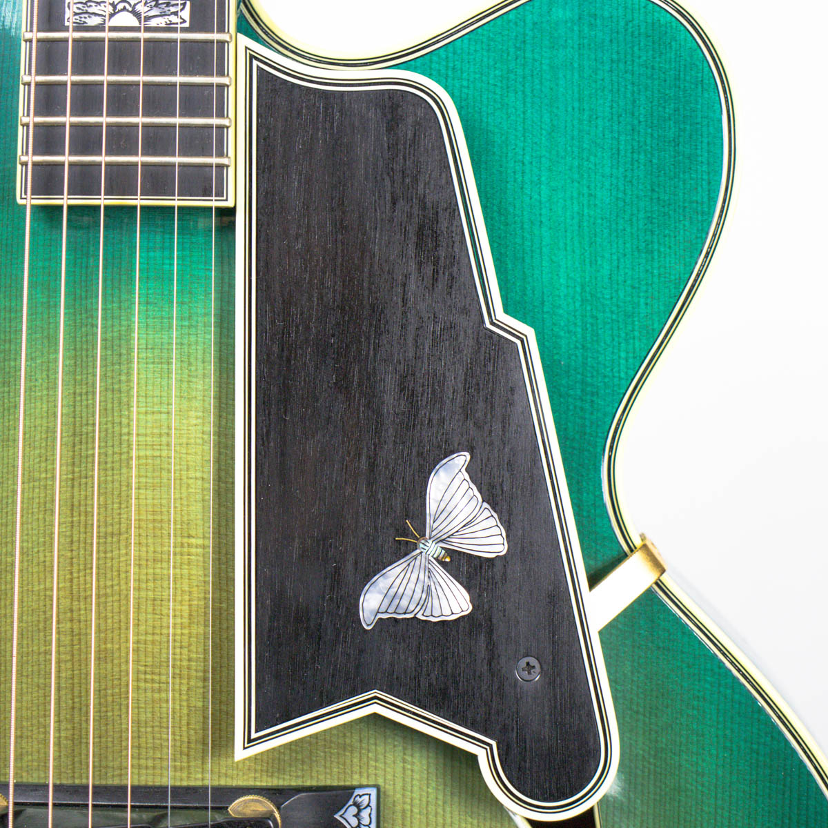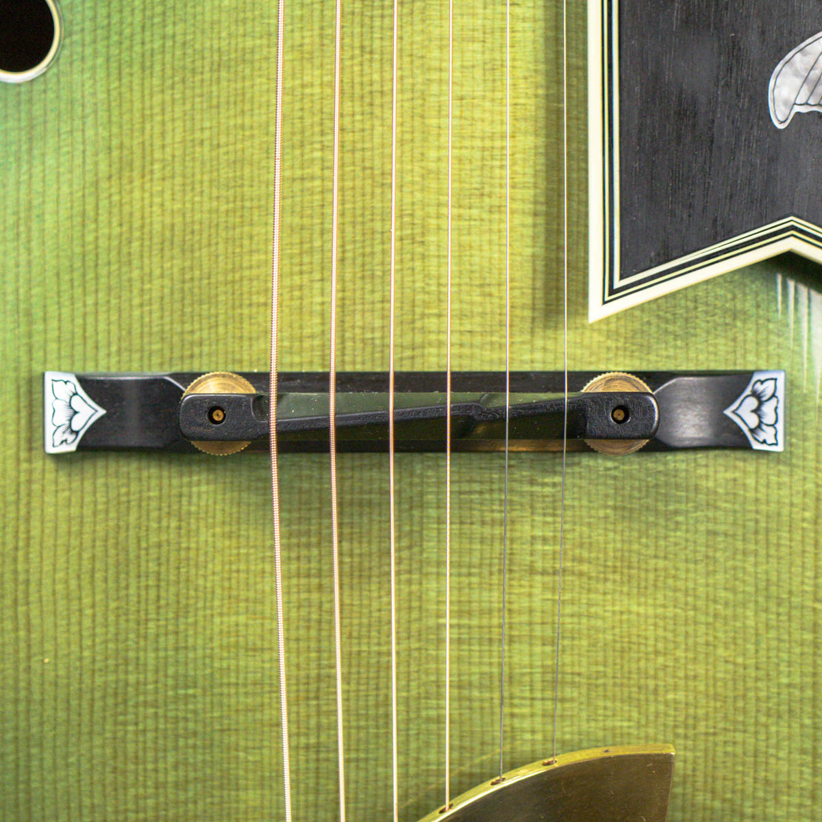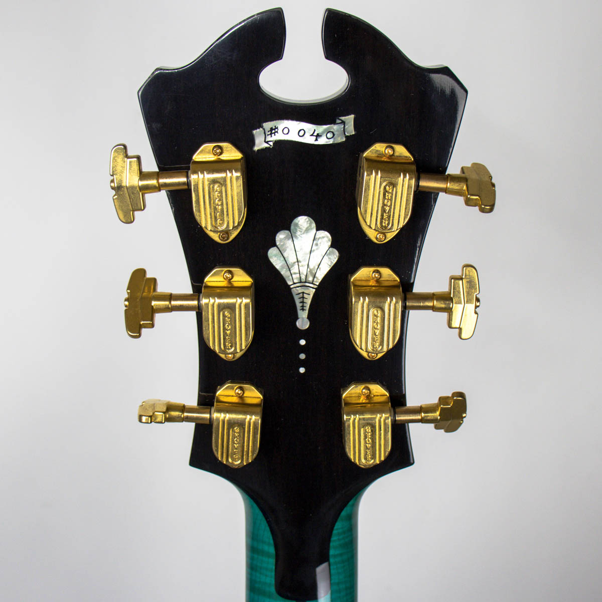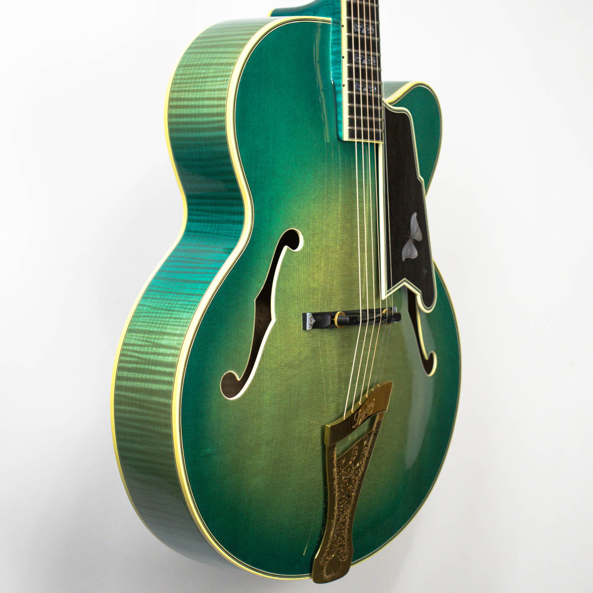 And what a guitar–it is constructed with a spruce top, flamed maple back, sides, and neck. Ebony is utilized on the bridge, fingerboard, headstock veneer, and pickguard. Abalone and pearl are used throughout the guitar on the inlays of the bridge, fingerboard, pickguard, truss rod cover, and headstock overlay. The brass tailpiece features a soap-pierced design and is engraved and plated in eighteen karat gold. The headstock also comes equipped with gold plated Grover stair step style tuning buttons.