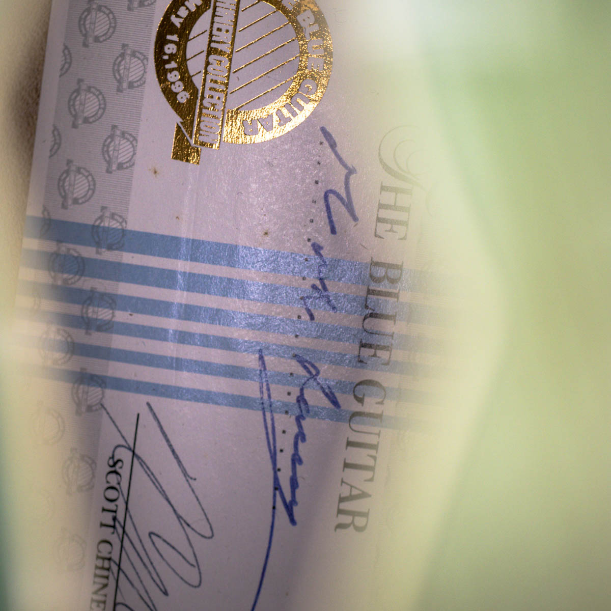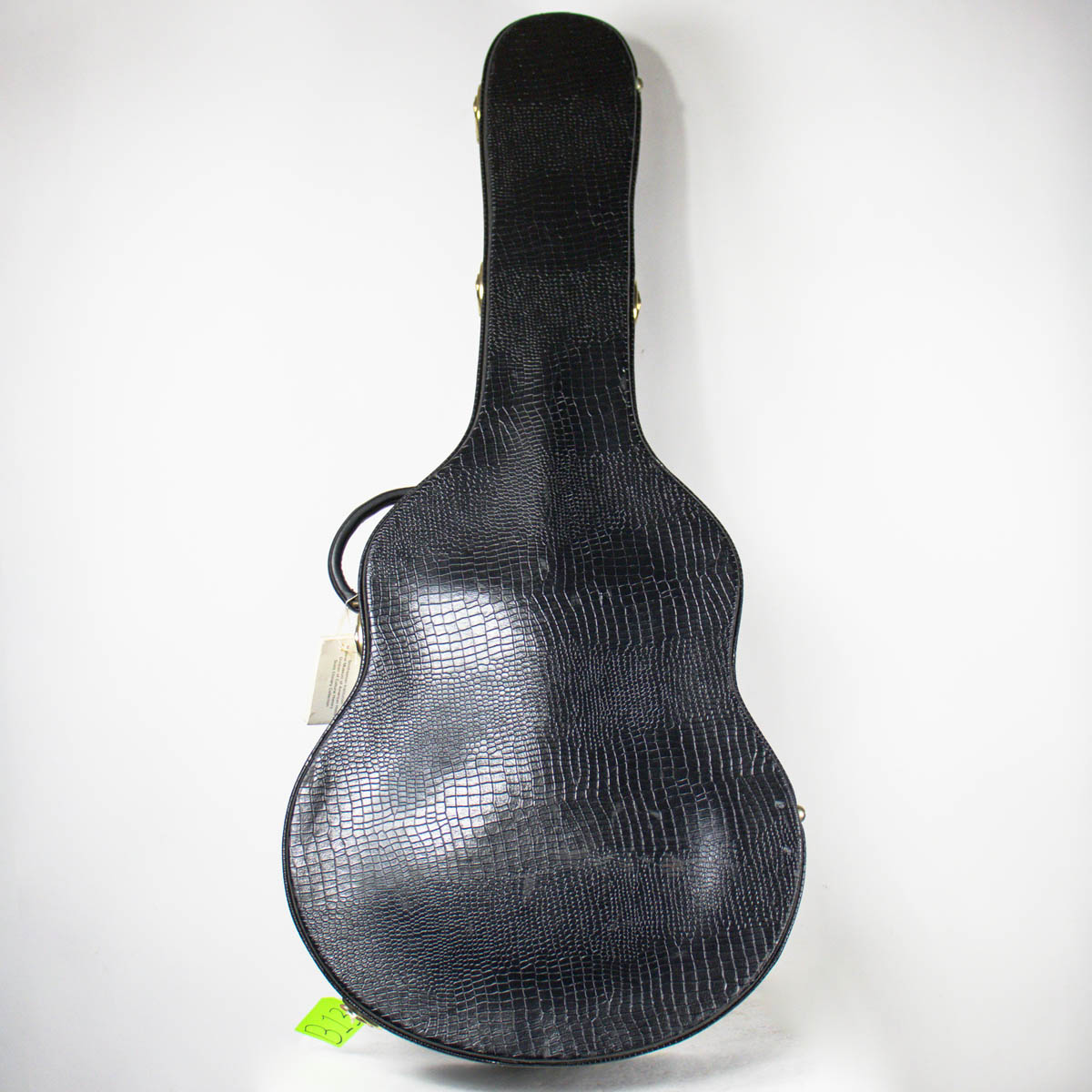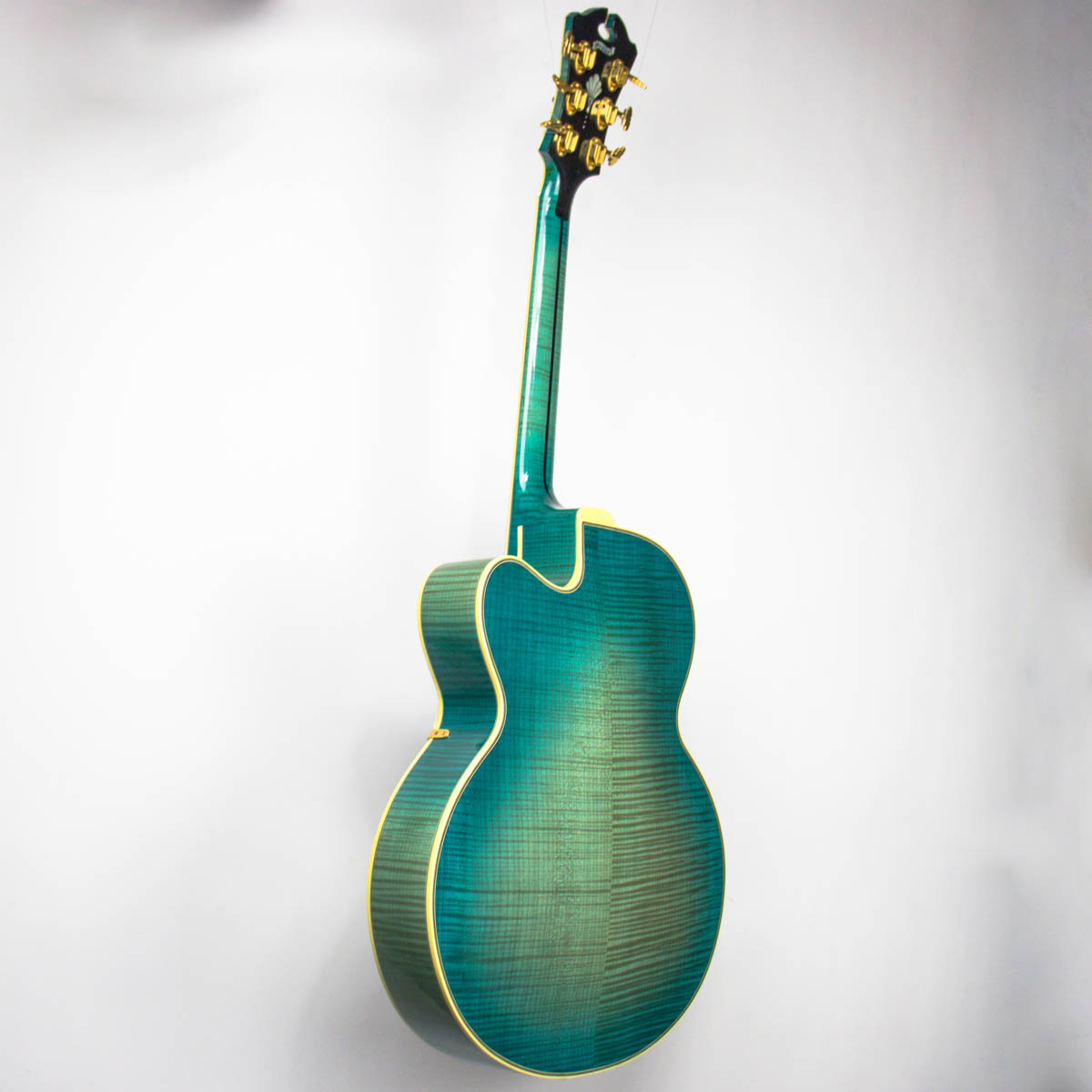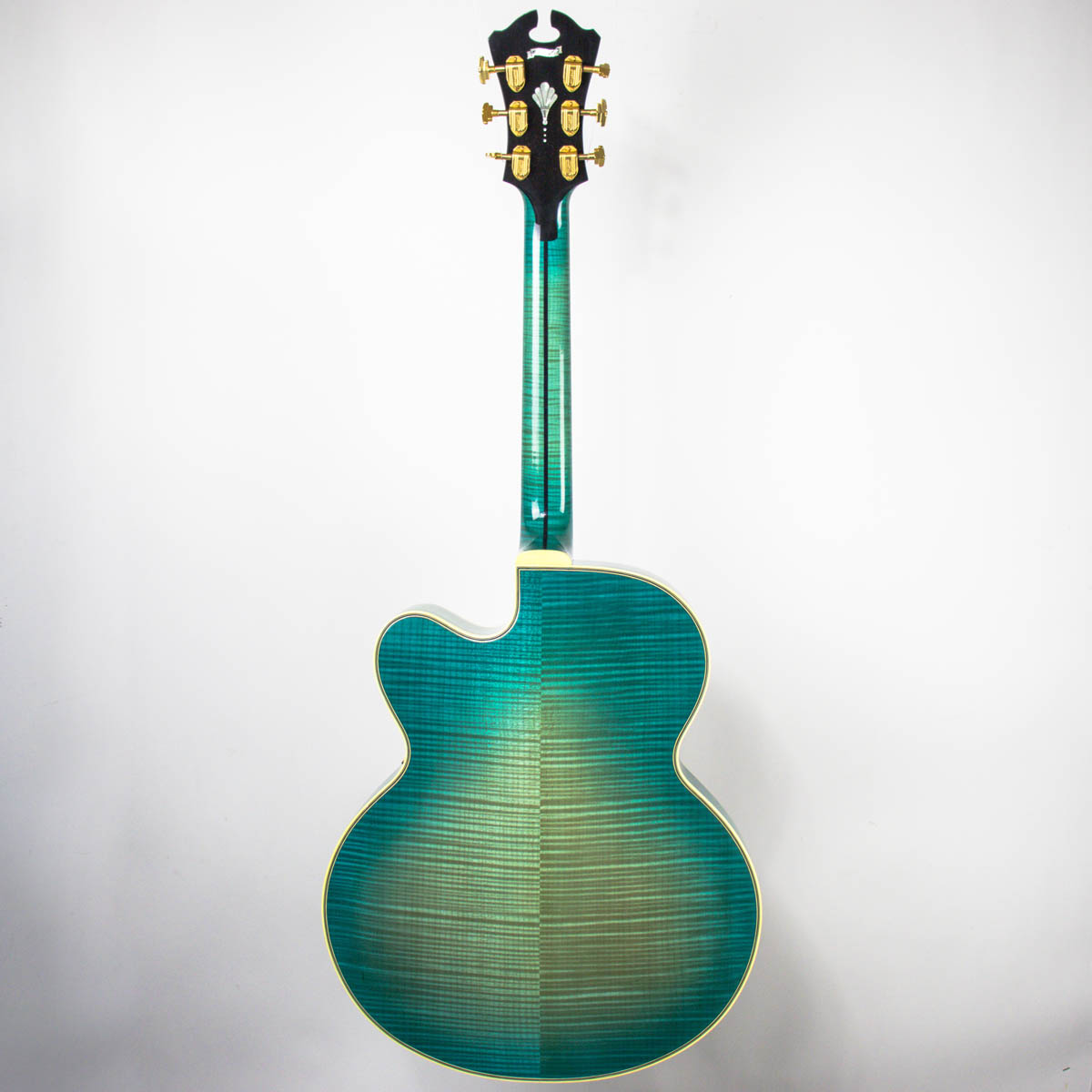 And what a guitar–it is constructed with a spruce top, flamed maple back, sides, and neck. Ebony is utilized on the bridge, fingerboard, headstock veneer, and pickguard. Abalone and pearl are used throughout the guitar on the inlays of the bridge, fingerboard, pickguard, truss rod cover, and headstock overlay. The brass tailpiece features a soap-pierced design and is engraved and plated in eighteen karat gold. The headstock also comes equipped with gold plated Grover stair step style tuning buttons.