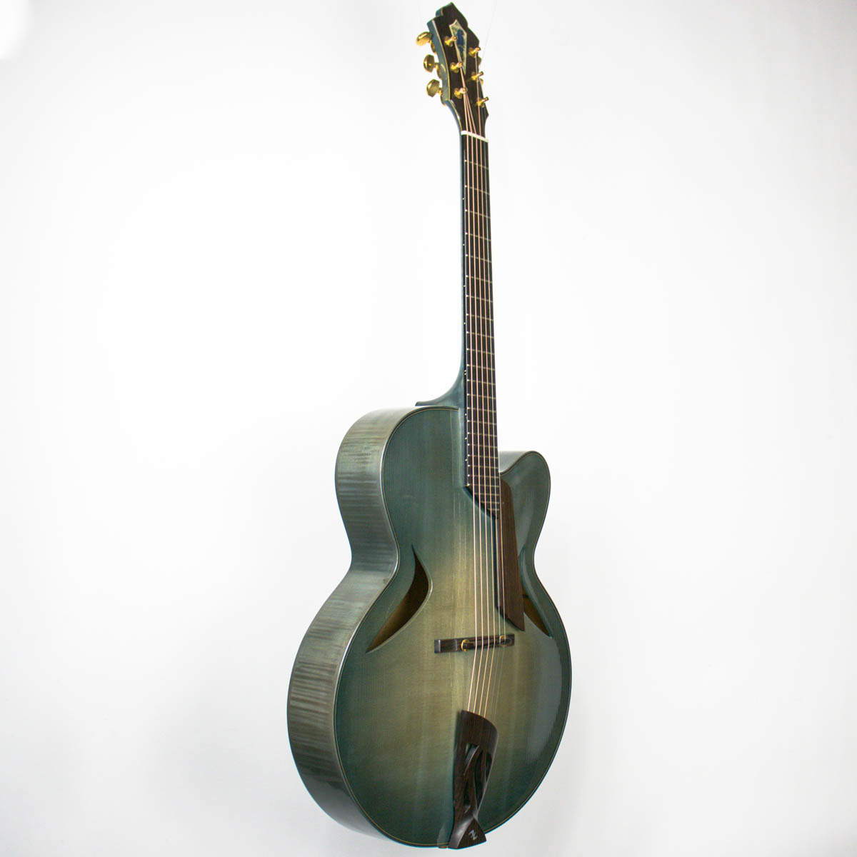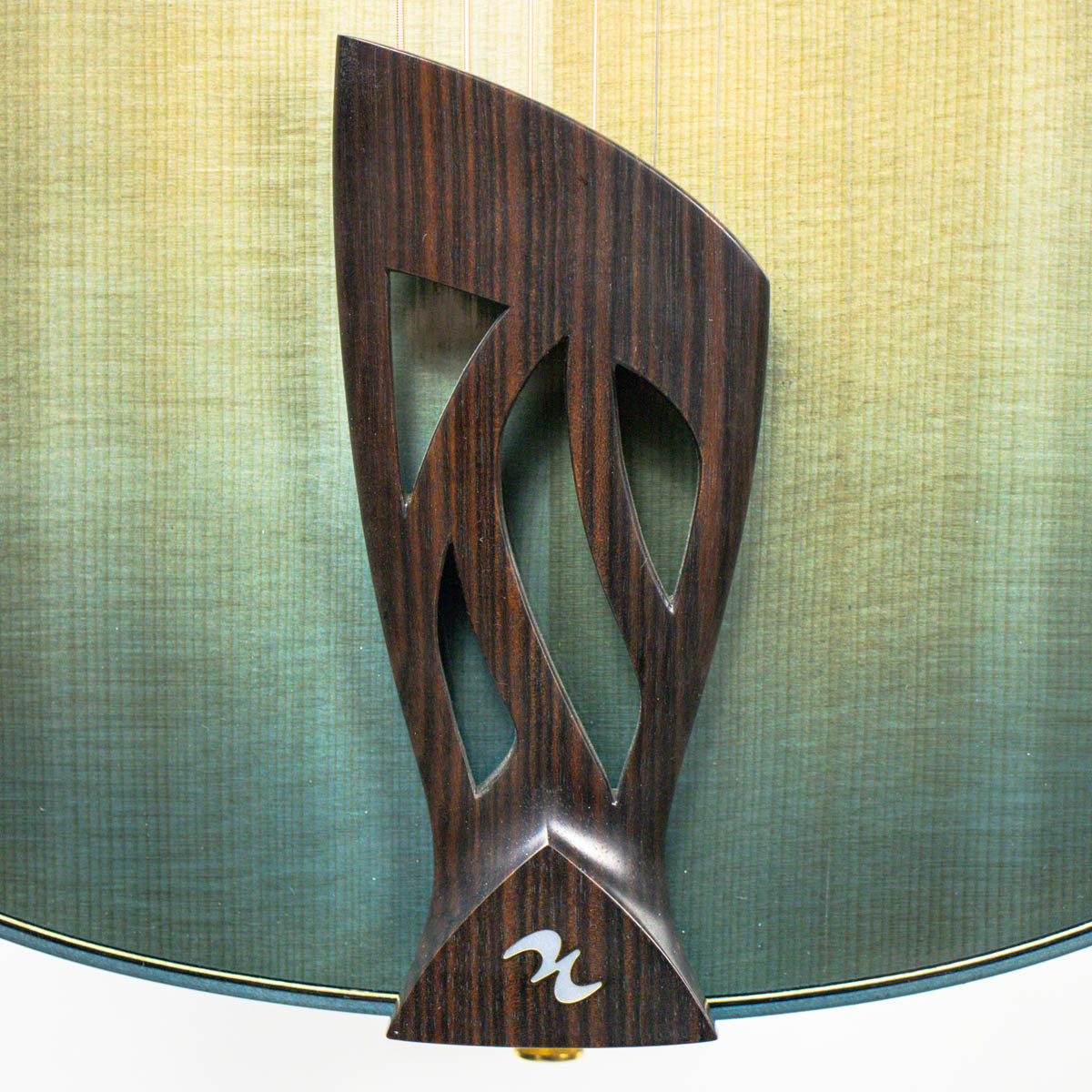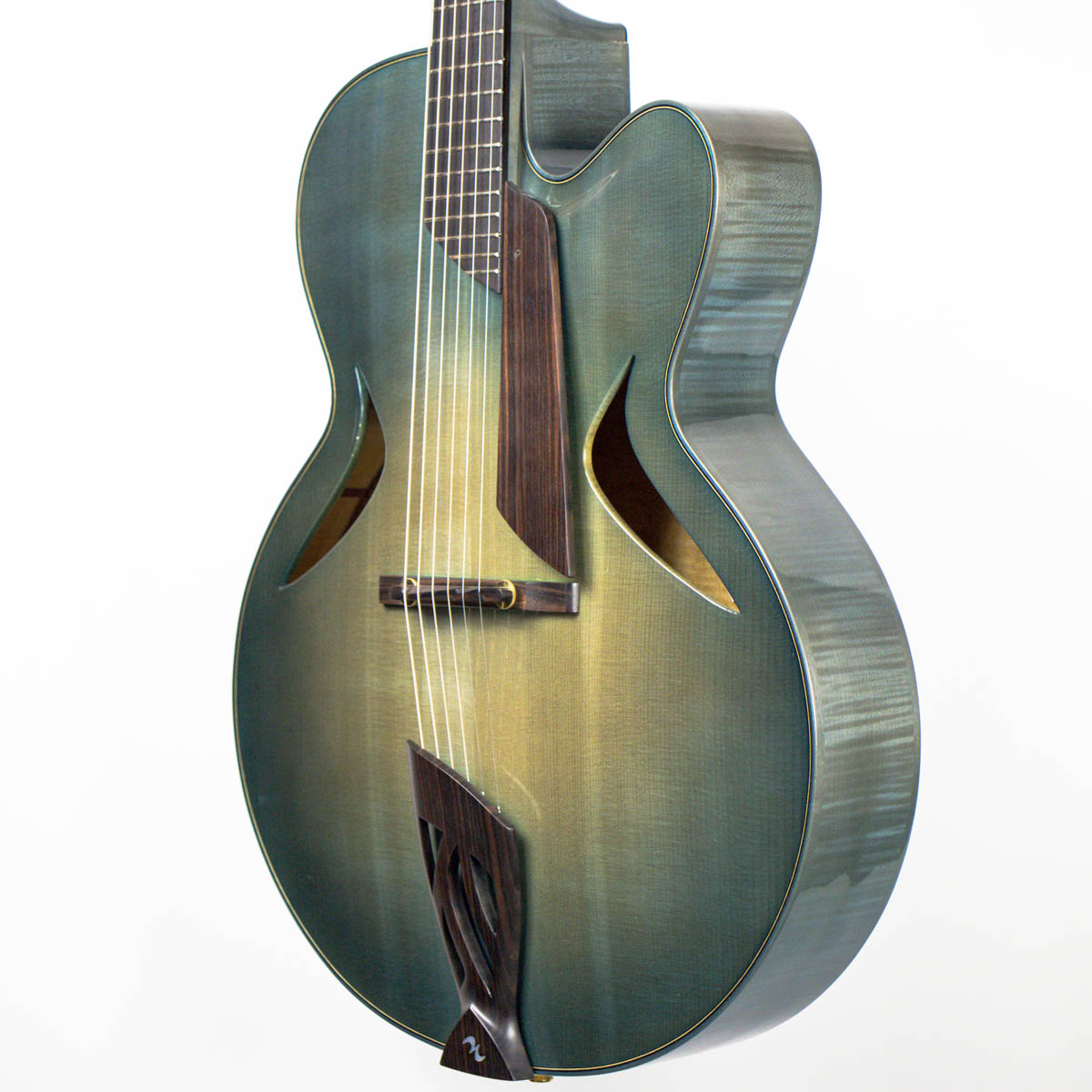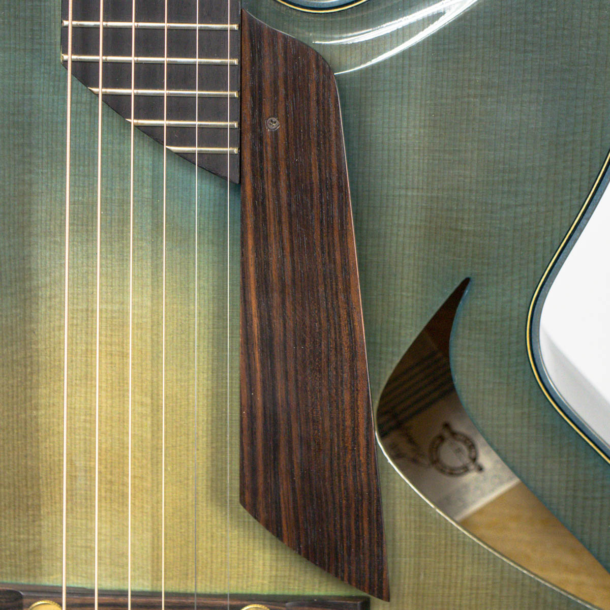 Nickerson’s Equinox Custom displays regal elegance and a concise design featuring only the necessary appointments required to make this instrument sing. The guitar was built with a spruce top and flame maple back, sides, and neck with maple binding. The fingerboard was crafted with ebony, and the bridge, pickguard, tailpiece and headstock overlay are all made with select pieces of Macassar ebony. The headstock comes with gold plated Schaller tuners and features a distinct engraving of the blue hyacinth macaw done by Petria Mitchell on the headstock face. Nickerson crafted the body of this guitar with unique placed and shaped soundholes that, in conjunction with the bracing pattern, both give the guitar a warmer tone and direct some of the sound towards the player’s ear.