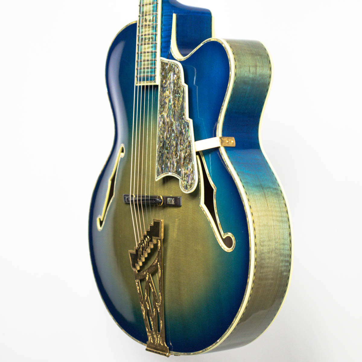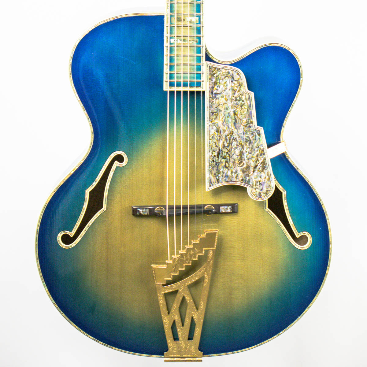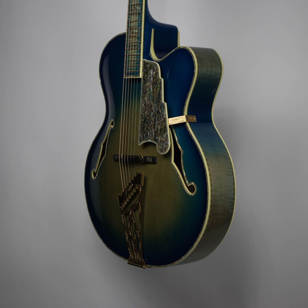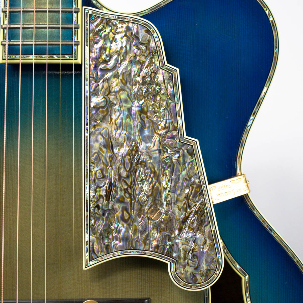 Triggs’ New Yorker is crafted with a sitka spruce top, book matched flamed maple back and sides. Following a “more is more” philosophy, the entire guitar features abalone trim inlays with ivoroid binding composed of white-and-blue check marquetry. Immediately striking to the eye, is the solid abalone pickguard, and distinctive blue sunburst figured maple fingerboard. Abalone is also used on the ebony bridge, and truss rod cover. The headstock is equipped with gold plated Grover Imperial stair step style tuning buttons and the abalone “J.Triggs” logo was actually designed by the late James D’Aquisto. Inspired by John D’Angelico’s original New Yorker design, Triggs’ New Yorker features the classic D’Angelico style headstock shape, inlay and finial, and gold engraved stair step style tailpiece.