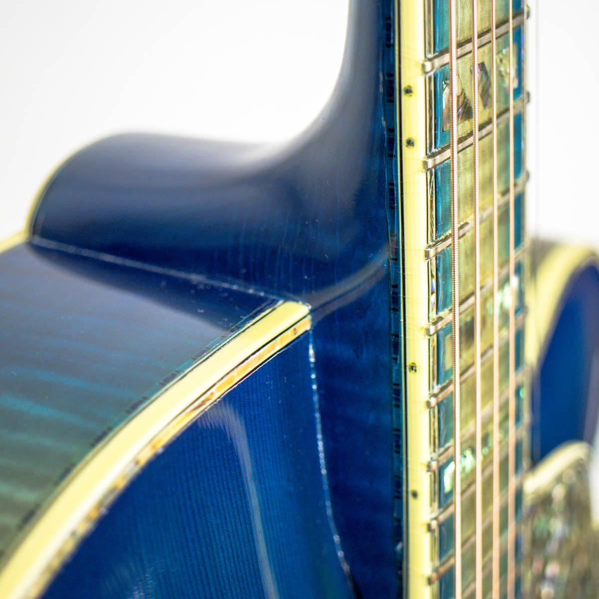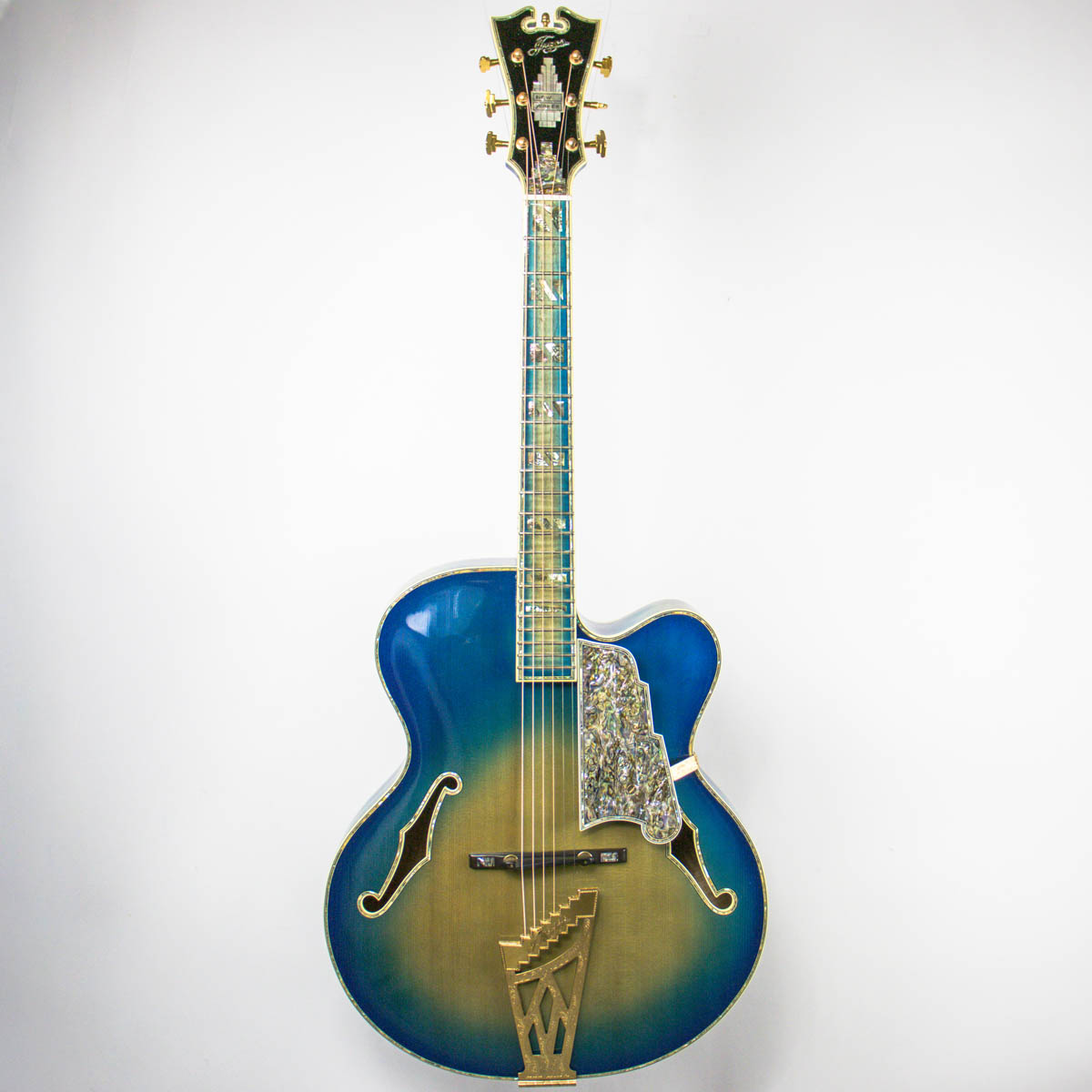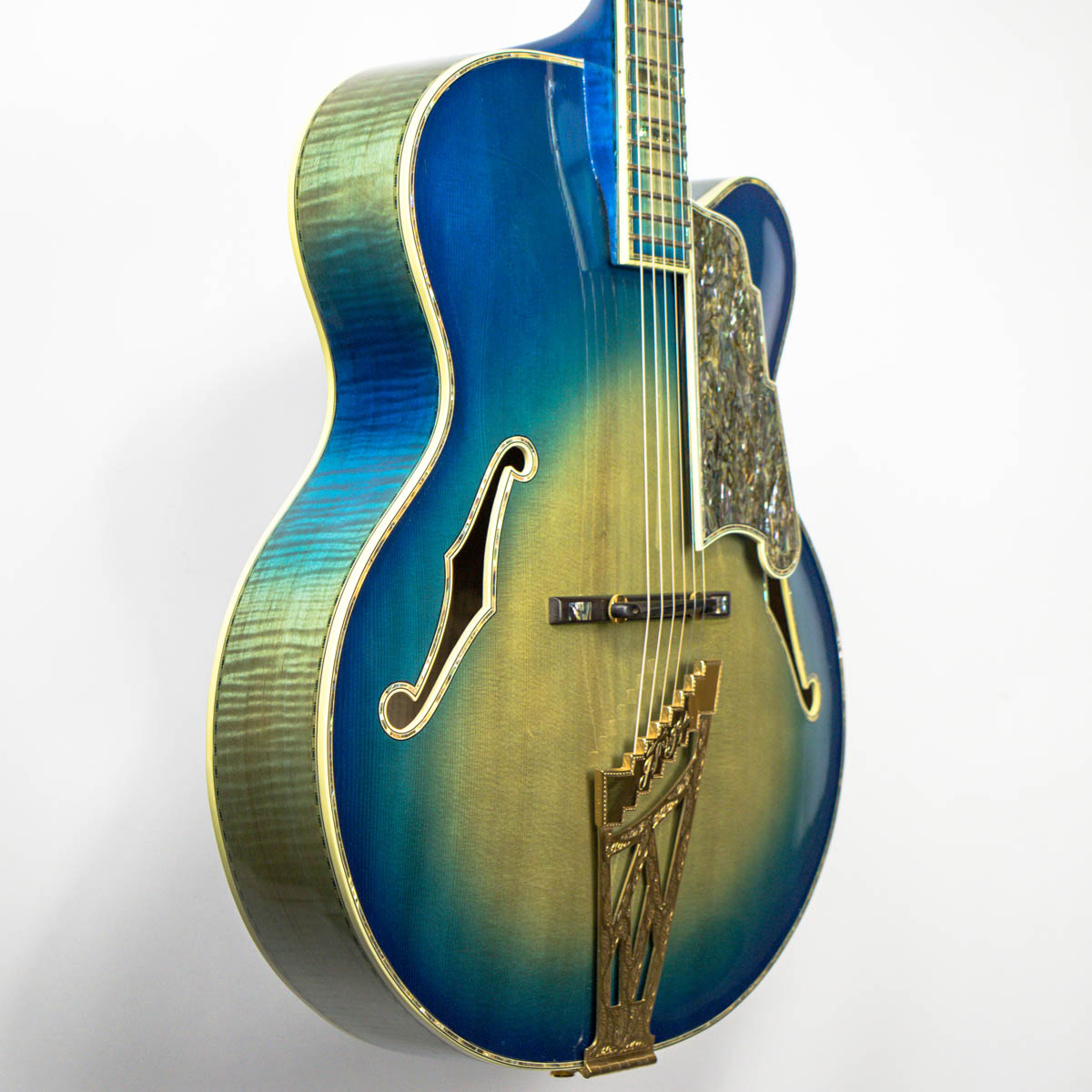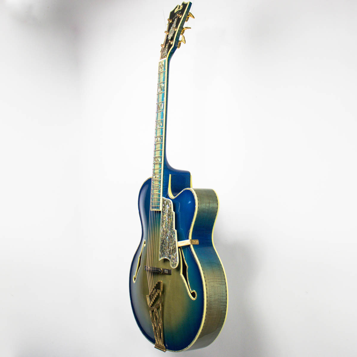 Triggs’ New Yorker is crafted with a sitka spruce top, book matched flamed maple back and sides. Following a “more is more” philosophy, the entire guitar features abalone trim inlays with ivoroid binding composed of white-and-blue check marquetry. Immediately striking to the eye, is the solid abalone pickguard, and distinctive blue sunburst figured maple fingerboard. Abalone is also used on the ebony bridge, and truss rod cover. The headstock is equipped with gold plated Grover Imperial stair step style tuning buttons and the abalone “J.Triggs” logo was actually designed by the late James D’Aquisto. Inspired by John D’Angelico’s original New Yorker design, Triggs’ New Yorker features the classic D’Angelico style headstock shape, inlay and finial, and gold engraved stair step style tailpiece.