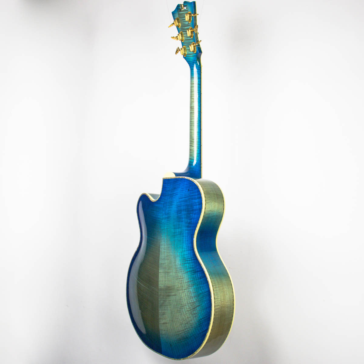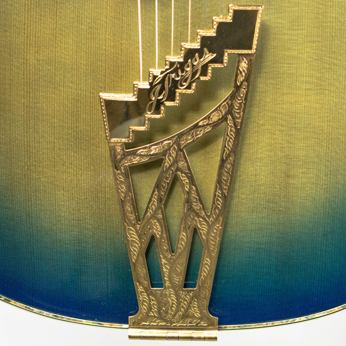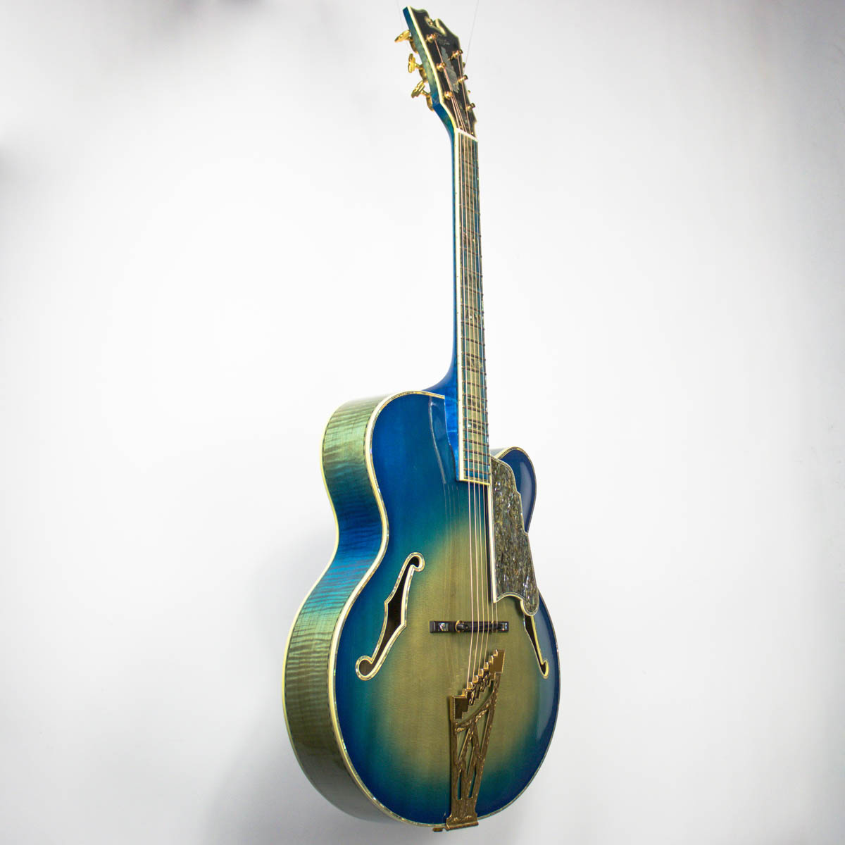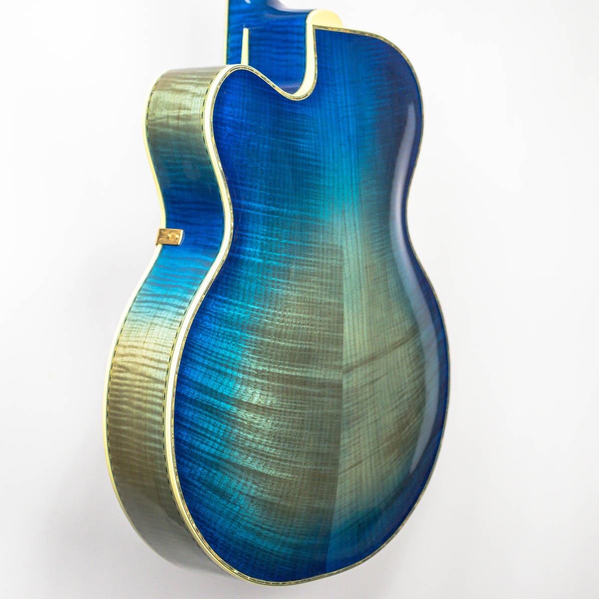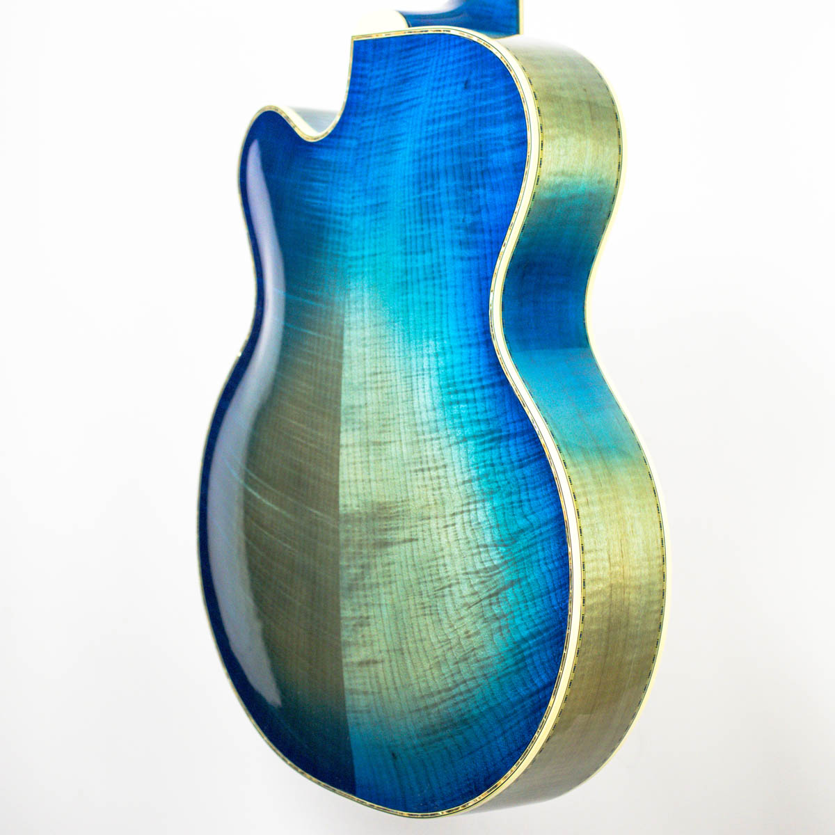 Triggs’ New Yorker is crafted with a sitka spruce top, book matched flamed maple back and sides. Following a “more is more” philosophy, the entire guitar features abalone trim inlays with ivoroid binding composed of white-and-blue check marquetry. Immediately striking to the eye, is the solid abalone pickguard, and distinctive blue sunburst figured maple fingerboard. Abalone is also used on the ebony bridge, and truss rod cover. The headstock is equipped with gold plated Grover Imperial stair step style tuning buttons and the abalone “J.Triggs” logo was actually designed by the late James D’Aquisto. Inspired by John D’Angelico’s original New Yorker design, Triggs’ New Yorker features the classic D’Angelico style headstock shape, inlay and finial, and gold engraved stair step style tailpiece.