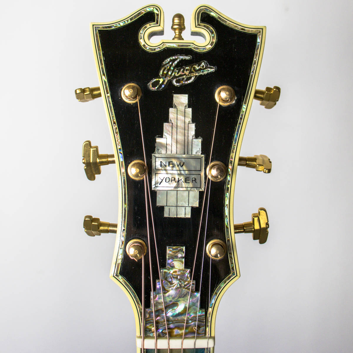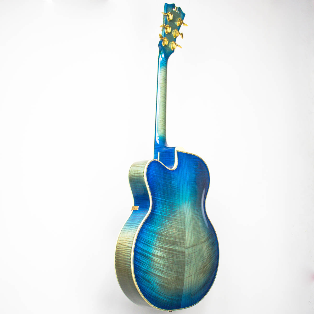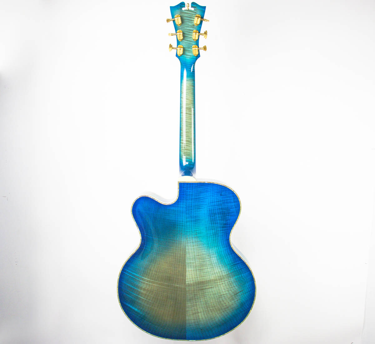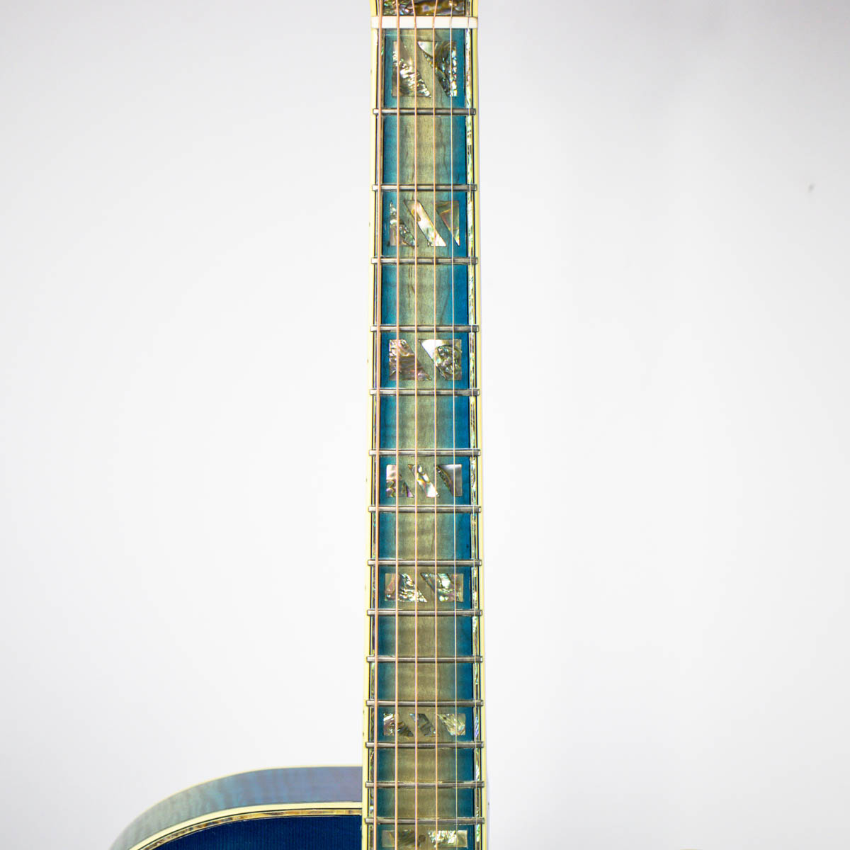 Triggs’ New Yorker is crafted with a sitka spruce top, book matched flamed maple back and sides. Following a “more is more” philosophy, the entire guitar features abalone trim inlays with ivoroid binding composed of white-and-blue check marquetry. Immediately striking to the eye, is the solid abalone pickguard, and distinctive blue sunburst figured maple fingerboard. Abalone is also used on the ebony bridge, and truss rod cover. The headstock is equipped with gold plated Grover Imperial stair step style tuning buttons and the abalone “J.Triggs” logo was actually designed by the late James D’Aquisto. Inspired by John D’Angelico’s original New Yorker design, Triggs’ New Yorker features the classic D’Angelico style headstock shape, inlay and finial, and gold engraved stair step style tailpiece.