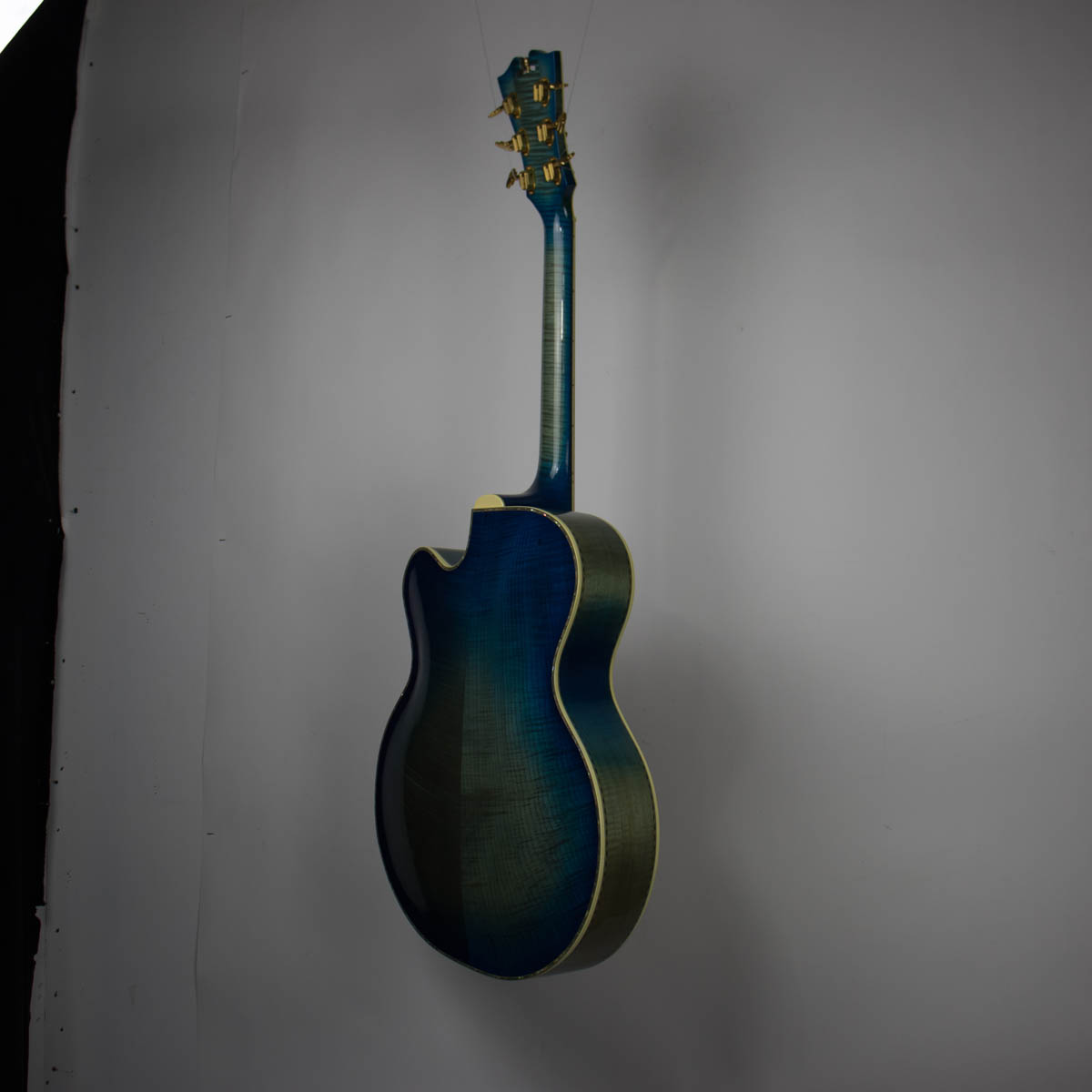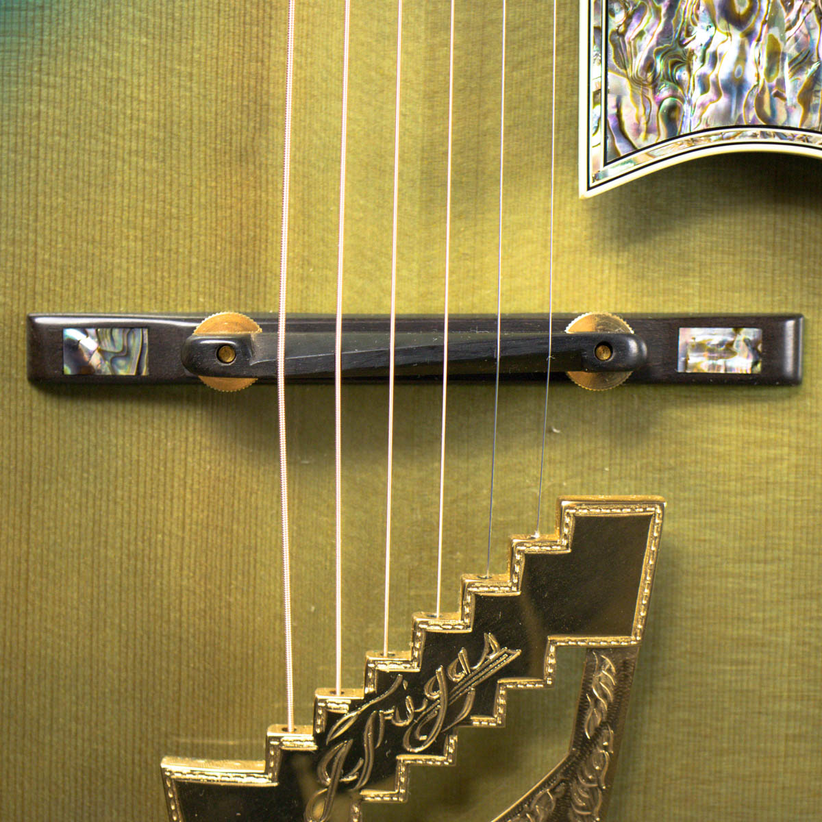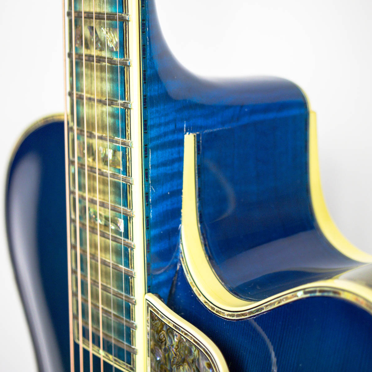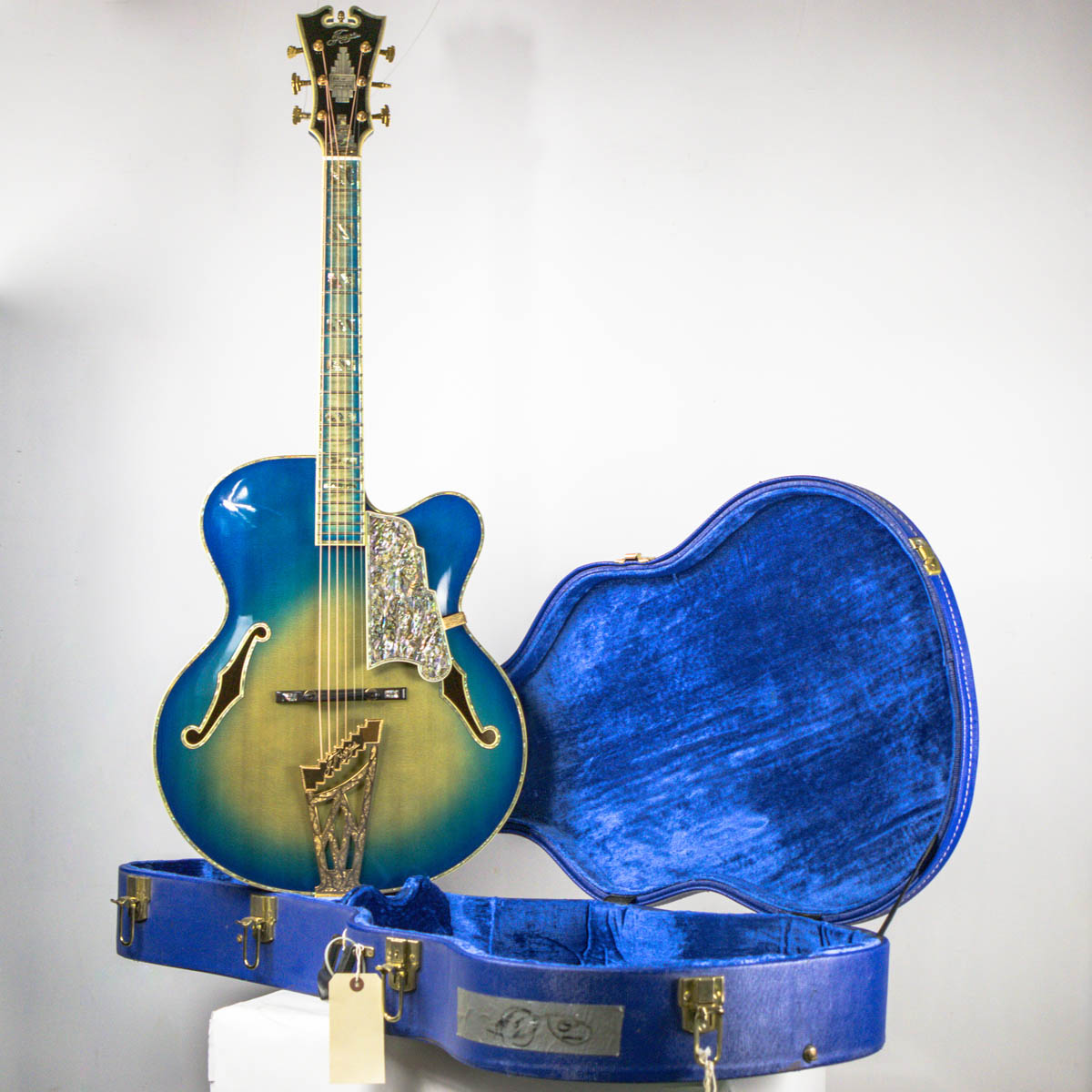 Triggs’ New Yorker is crafted with a sitka spruce top, book matched flamed maple back and sides. Following a “more is more” philosophy, the entire guitar features abalone trim inlays with ivoroid binding composed of white-and-blue check marquetry. Immediately striking to the eye, is the solid abalone pickguard, and distinctive blue sunburst figured maple fingerboard. Abalone is also used on the ebony bridge, and truss rod cover. The headstock is equipped with gold plated Grover Imperial stair step style tuning buttons and the abalone “J.Triggs” logo was actually designed by the late James D’Aquisto. Inspired by John D’Angelico’s original New Yorker design, Triggs’ New Yorker features the classic D’Angelico style headstock shape, inlay and finial, and gold engraved stair step style tailpiece.